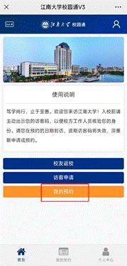 手机关注“e江南”微信公众号,点击屏幕下方“校园服务”中的“访客预约”,进入后点击“我的预约”,点击“查看访客码”即可获得访客码。进入校园时出示访客码。