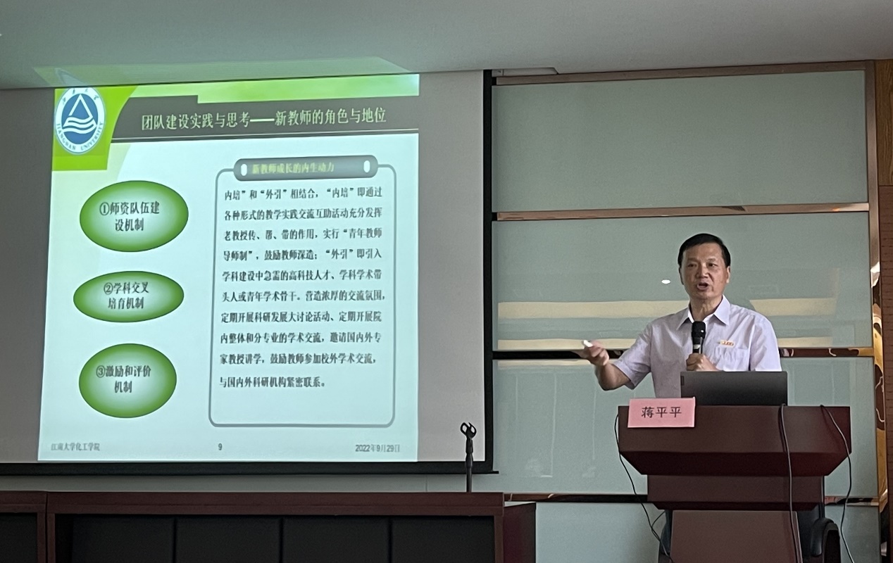 本次交流活动围绕青年教师教书育人、教学与科研和在团队中成长等方面展开,三位特邀专家为大家带来了精彩的报告。同济大学杜建忠教授的报告题目为:“青年教师如何做更好的科研”。他将科学研究分为三种类型:“前无古人,后有来者”、“前有古人,后无来者”、“前有古人,后有来者”。他结合自身开拓“以糖控糖”新领域的经历,强调了青年教师选择研究领域的重要性。他希望,各位青年教师要具备战略性思维,充分发挥自身潜能,结合团队和学科发展需要,做“有组织”的科研。化工学院蒋平平教授以“敬业与奋进,责任与奉献”为主题,阐述了科研团队的内涵与本质、新教师的角色与地位。他提出,青年教师要勇于追求“学院首次”,在知识多元化、学科交叉化趋势加强的背景下,珍惜学院氛围,加快融入团队,实现合作共赢,在成全学生的同时成就自己。黄漫