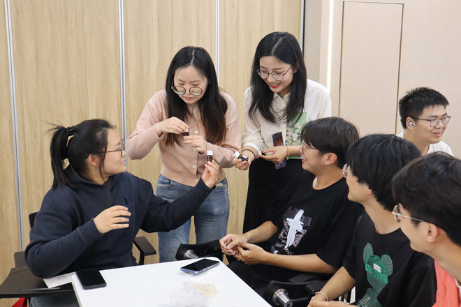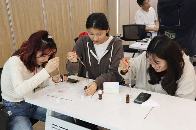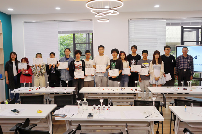活动第三部分为“心手互动”。在储鸿老师的讲解和指导下,同学们掌握了调制香水的方式方法。在选择香精和调制香水的过程中,同学们积极交流互动,在实操环节互帮互助,最终每位同学都得到了一瓶代表个人独家记忆的香水。在由各位老师和研究生组成的“品香团”品鉴评比后,最终有12名同学被评为“优秀小调香师”。随后,吴园一和储鸿为“优秀小调香师”们颁发证书。